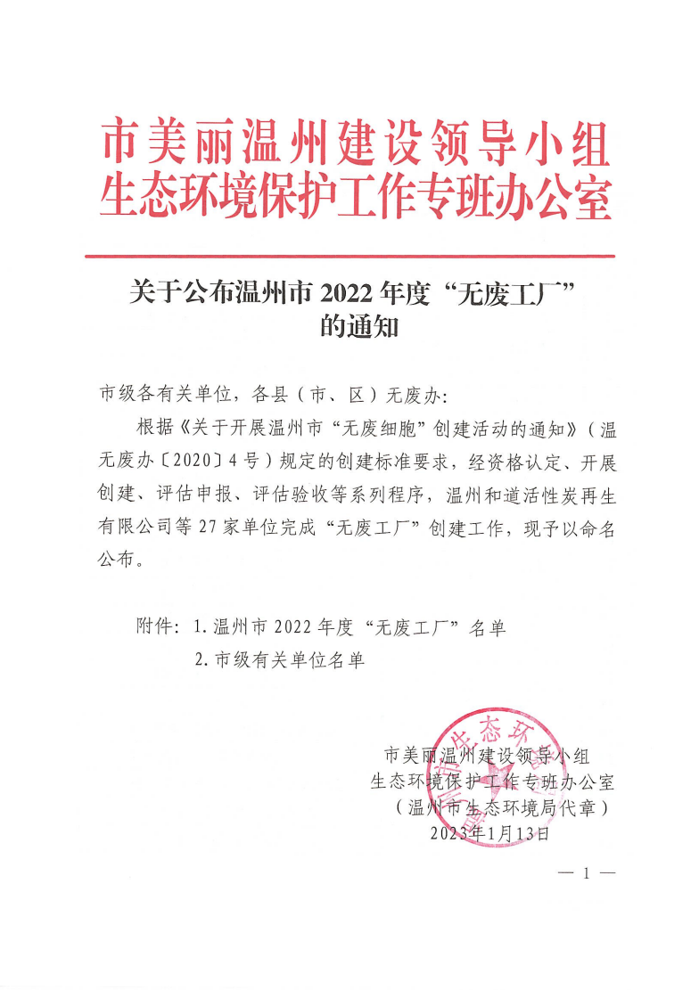 關(guān)于公布溫州市2022年度“無(wú)廢工廠”的通知